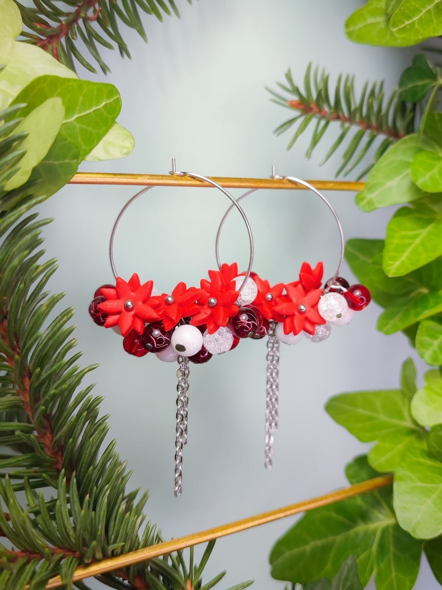 Polymer clay and glass beads. Metal parts are hypoallergenic: surgical steel or 18 carat gold plated surgical steel. Jewellery is nickel free. All parts are waterproof.