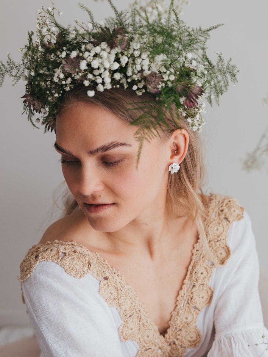 Polymer clay and glass beads. Metal parts are hypoallergenic: surgical steel or 18 carat gold plated surgical steel. Jewellery is nickel free. All parts are waterproof.