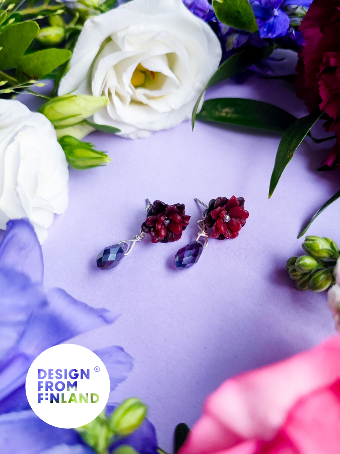 Polymer clay and glass beads. Metal parts are hypoallergenic: surgical steel or 18 carat gold plated surgical steel. Jewellery is nickel free. All parts are waterproof.