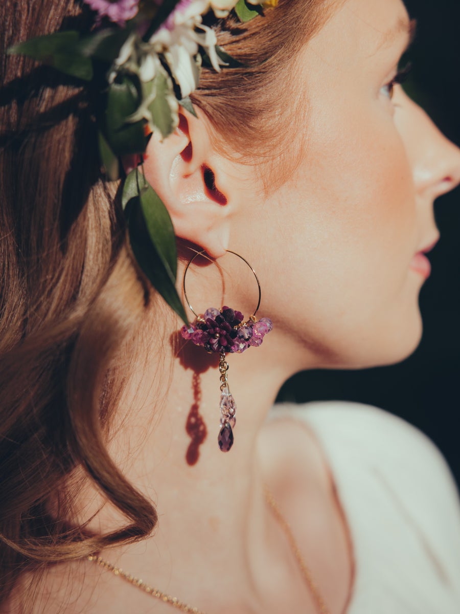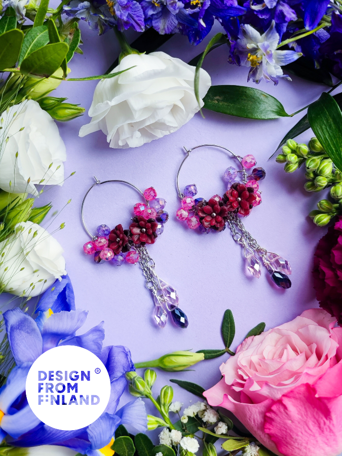 Polymer clay and glass beads. Metal parts are hypoallergenic: surgical steel or 18 carat gold plated surgical steel. Jewellery is nickel free. All parts are waterproof.