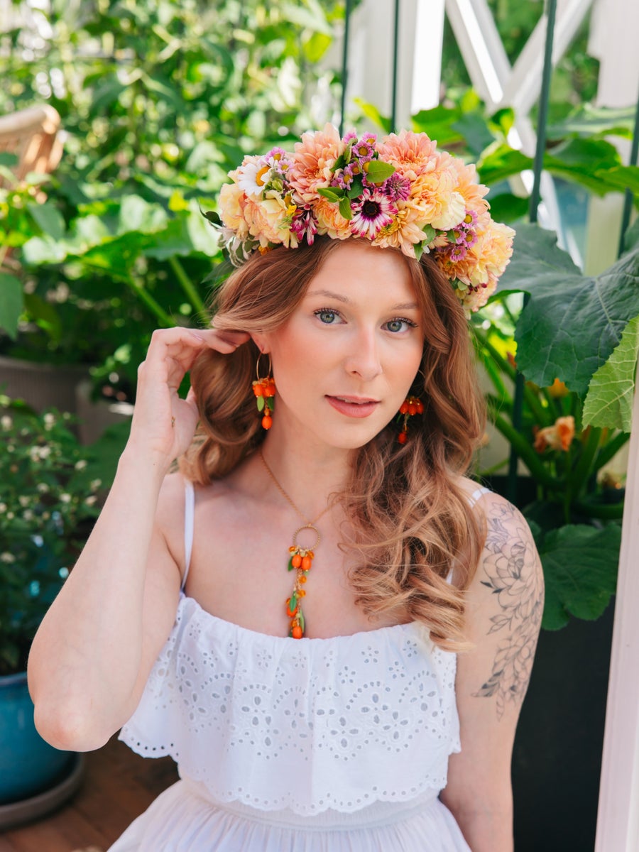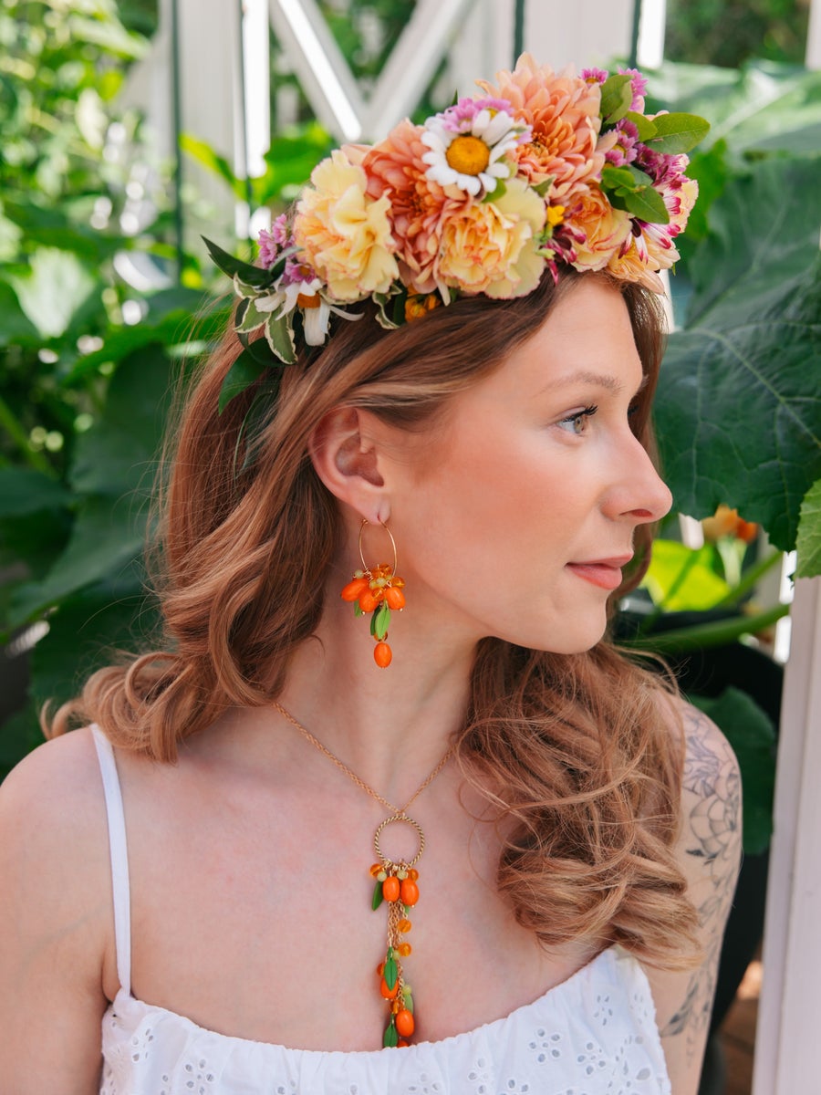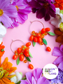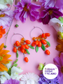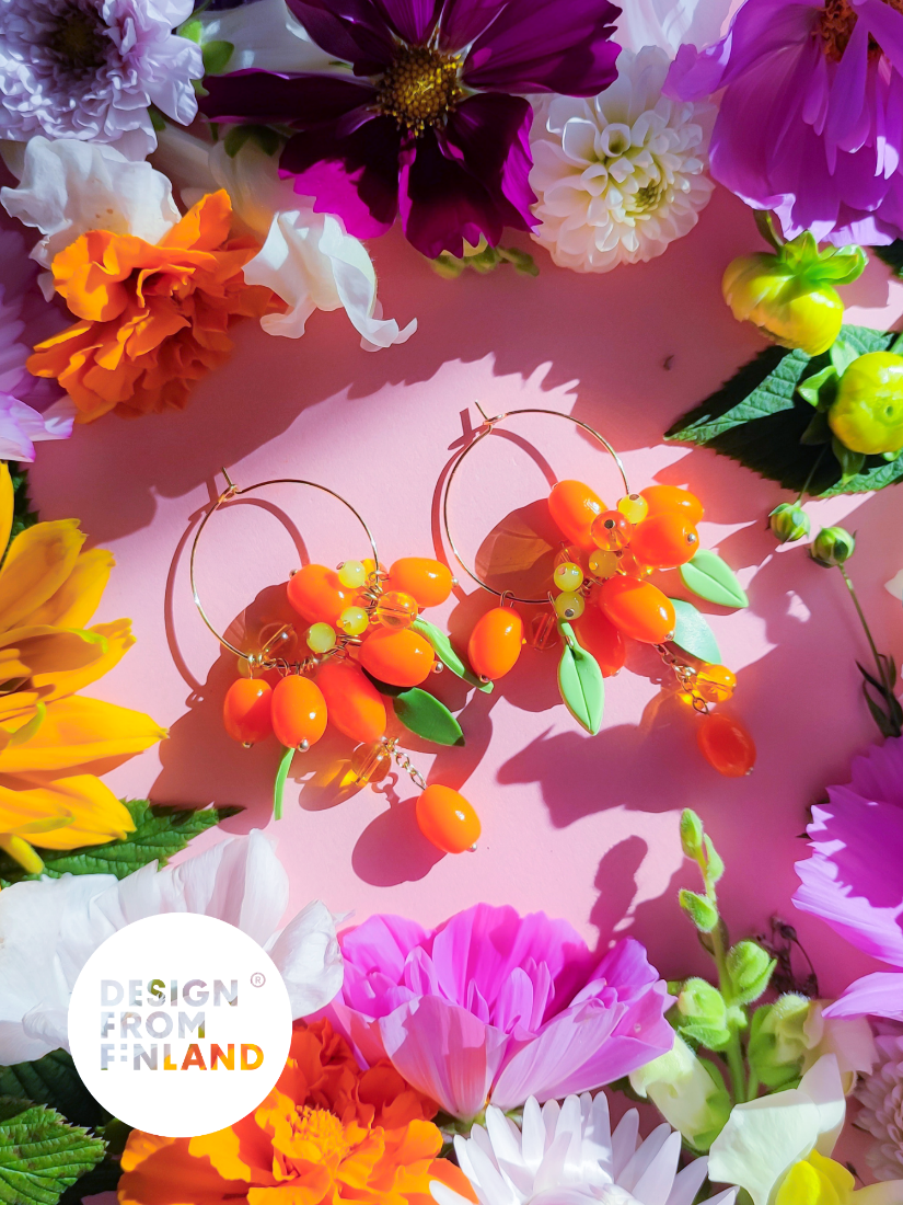 Polymer clay and glass beads. Metal parts are hypoallergenic: surgical steel or 18 carat gold plated surgical steel. Jewellery is nickel free. All parts are waterproof.