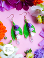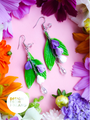 Polymer clay and glass beads. Metal parts are hypoallergenic: surgical steel or 18 carat gold plated surgical steel. Jewellery is nickel free. All parts are waterproof.