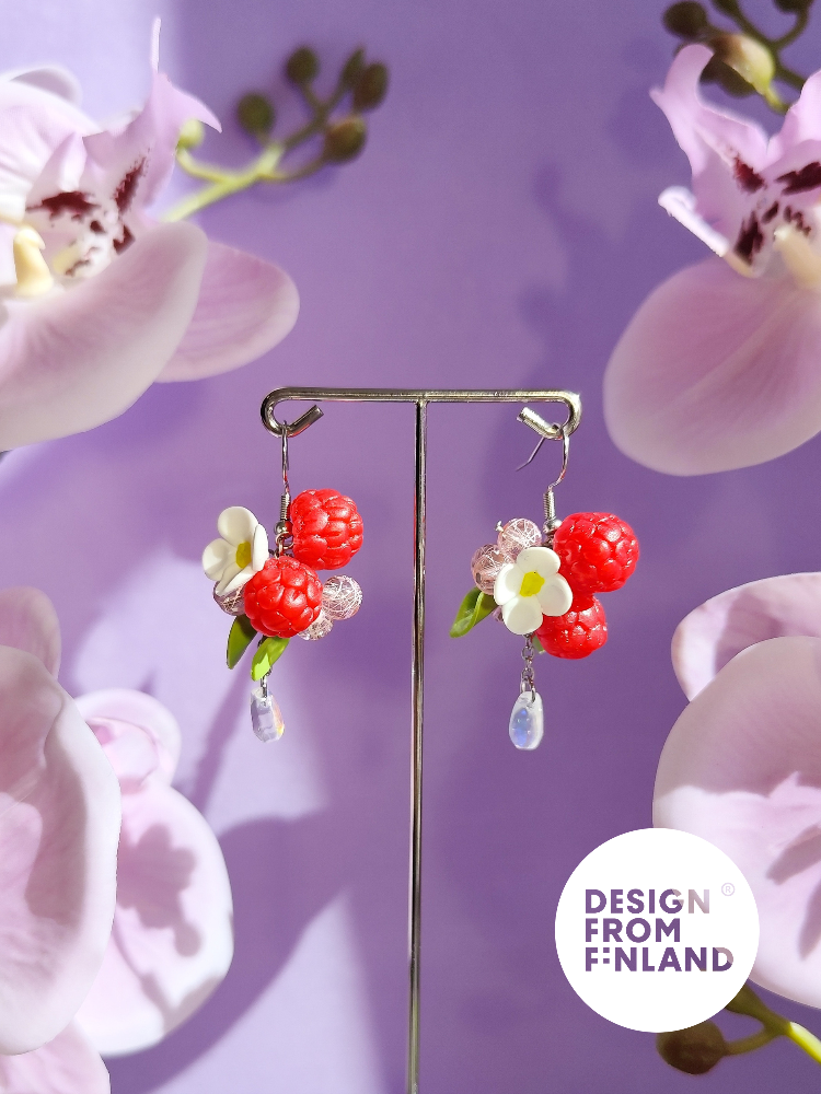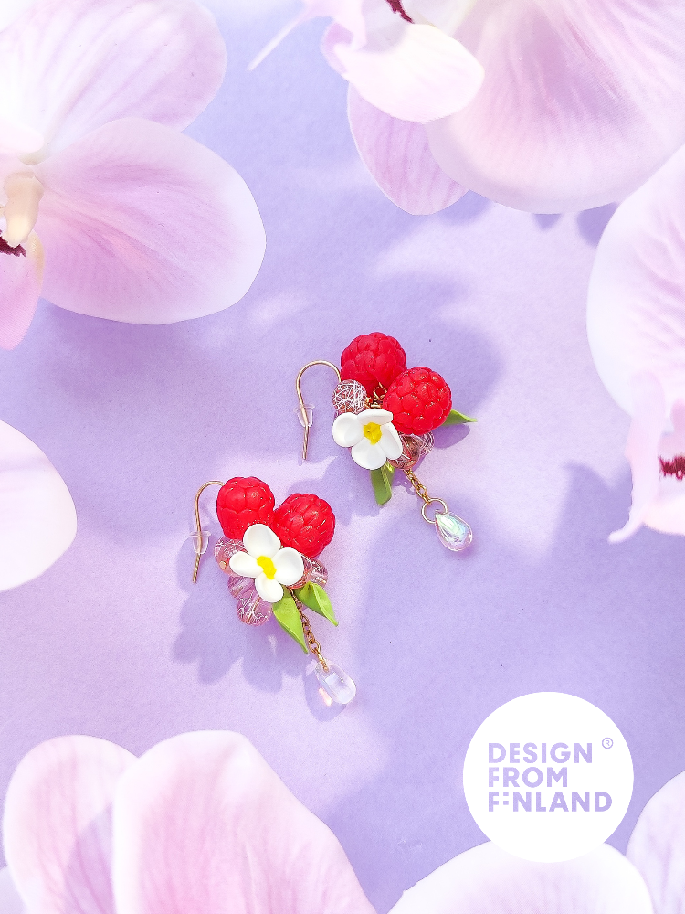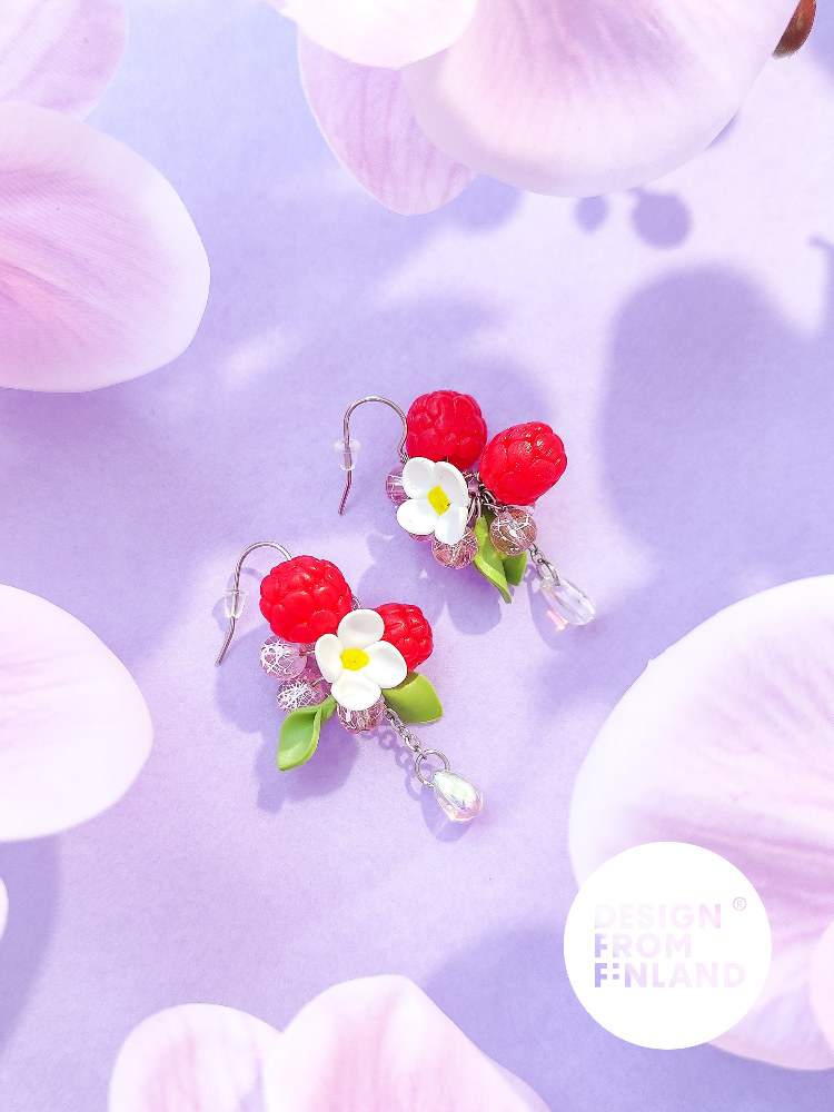 Raspberry reminds many of summer flavors. In a hot summer day, it's divine to dive into the shadow inside a raspberry bush, while enjoying cool, deep pink and sweet drops of joy. A native wild raspberry also grows in Finland, and it's flavor is like straight from a childrensbook. In finnish folklore raspberry represents beauty, youth and womanhood. Raspberry collection consists of juicy raspberries, it's light green leaves and water drops condensed on top of the lovely pink berries. It's inspired by childhood raspberry bushes, where walking the endless winding paths a small human was able to get lost in play and adventure - endless jungle full of raspberries in the front, in the back and above, while the sun was gleaming among the leafy roof.