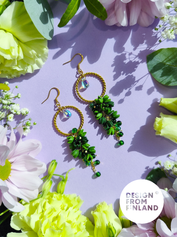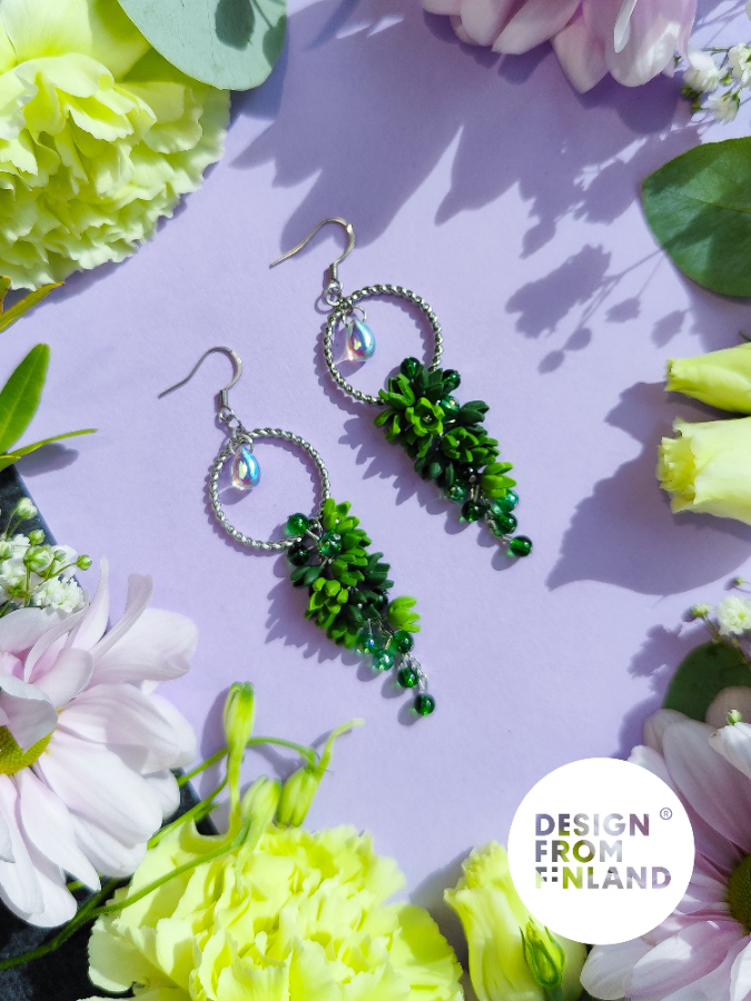 Handmade. Polymer clay and glass beads. Metal parts are hypoallergenic: surgical steel or 18 carat gold plated surgical steel. Jewellery is nickel free. All parts are waterproof.