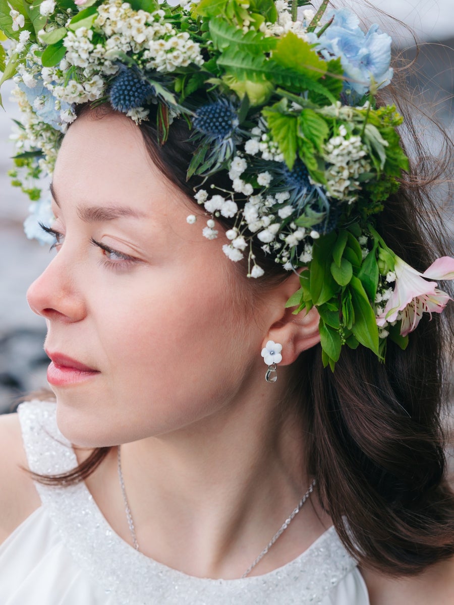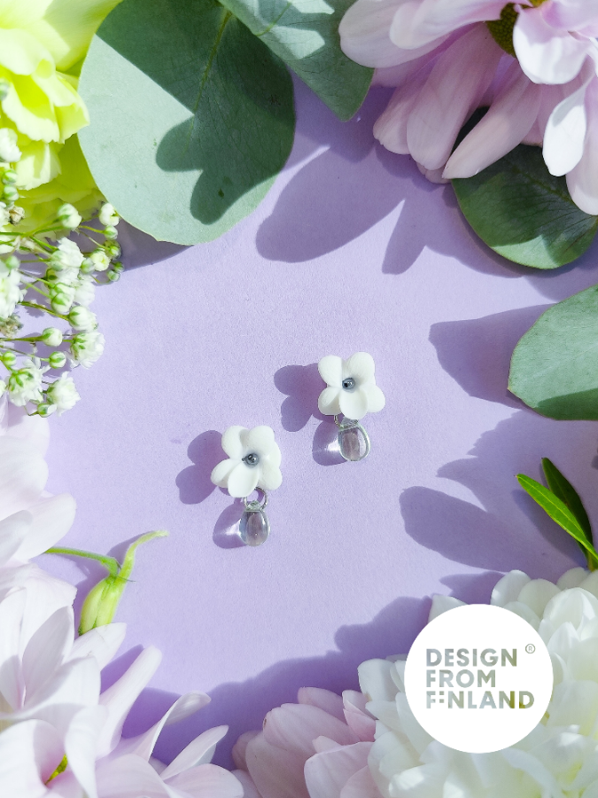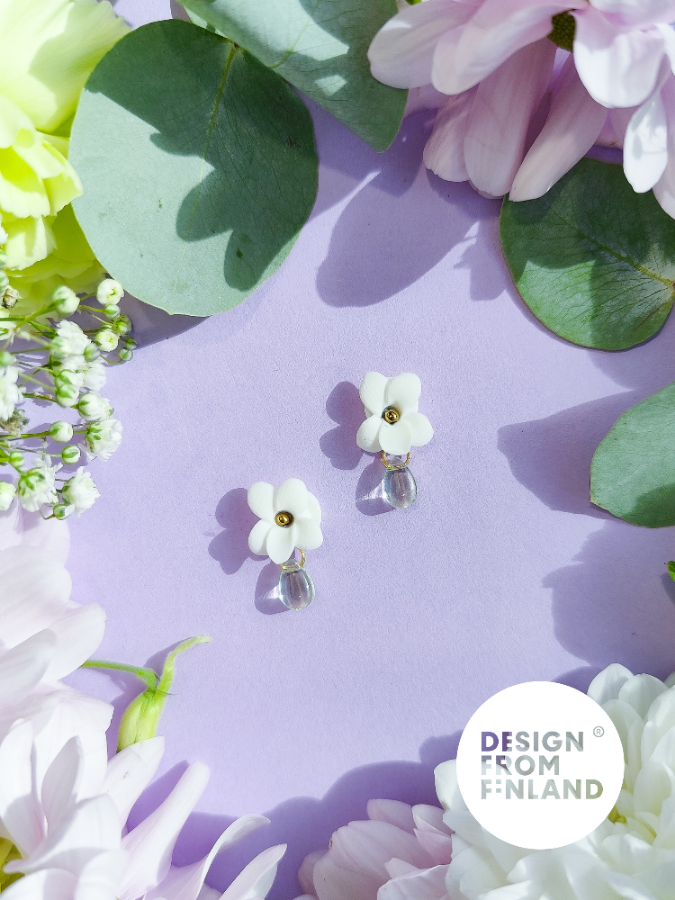 Handmade. Polymer clay and glass beads. Metal parts are hypoallergenic: surgical steel or 18 carat gold plated surgical steel. Jewellery is nickel free. All parts are waterproof.