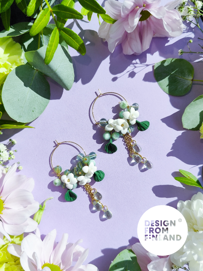 Handmade. Polymer clay and glass beads. Metal parts are hypoallergenic: surgical steel or 18 carat gold plated surgical steel. Jewellery is nickel free. All parts are waterproof.