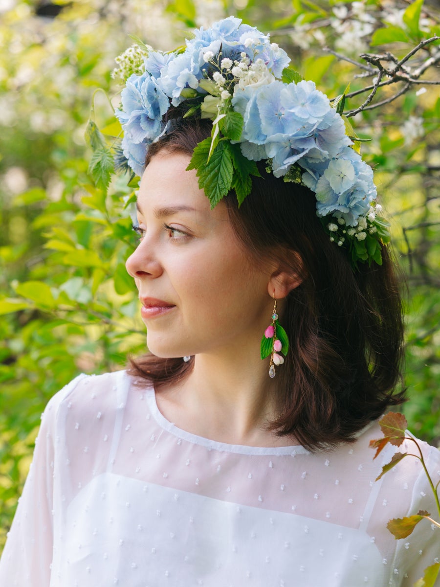 Polymer clay and glass beads. Metal parts are hypoallergenic: surgical steel or 18 carat gold plated surgical steel. Jewellery is nickel free. All parts are waterproof.