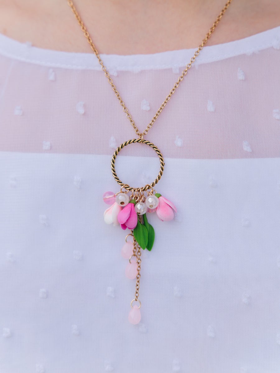 Polymer clay and glass beads. Metal parts are hypoallergenic: surgical steel or 18 carat gold plated surgical steel. Jewellery is nickel free. All parts are waterproof.