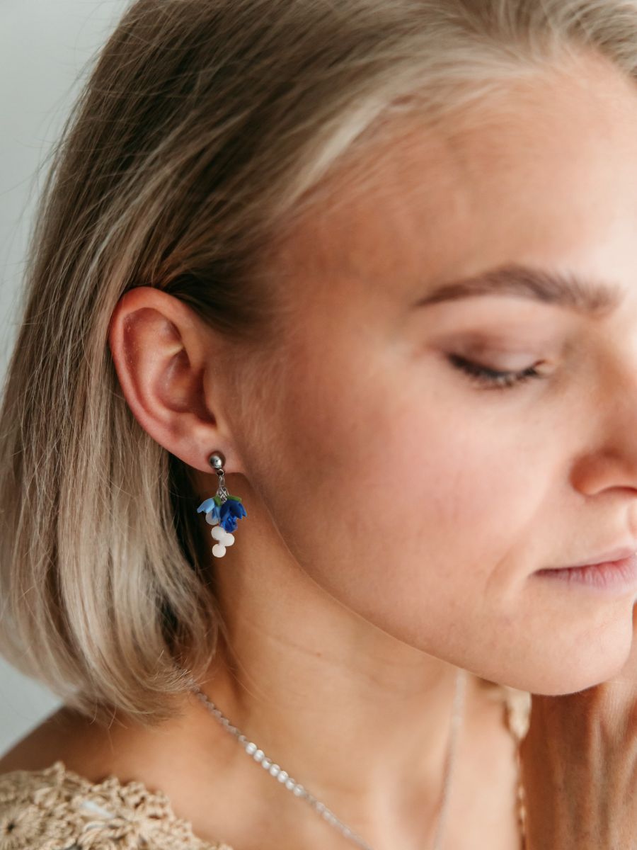 Handmade. Polymer clay and glass beads. Metal parts are hypoallergenic: surgical steel or 18 carat gold plated surgical steel. Jewellery is nickel free. All parts are waterproof.