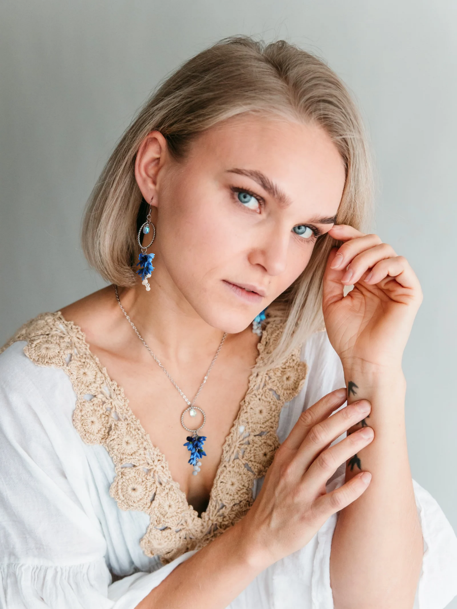 Handmade. Polymer clay and glass beads. Metal parts are hypoallergenic: surgical steel or 18 carat gold plated surgical steel. Jewellery is nickel free. All parts are waterproof.
