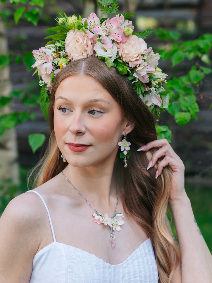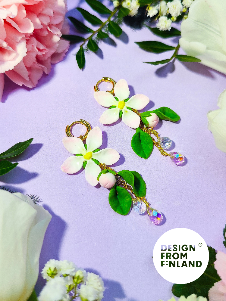 Handmade. Polymer clay and glass beads. Metal parts are hypoallergenic: surgical steel or 18 carat gold plated surgical steel. Jewellery is nickel free. All parts are waterproof.