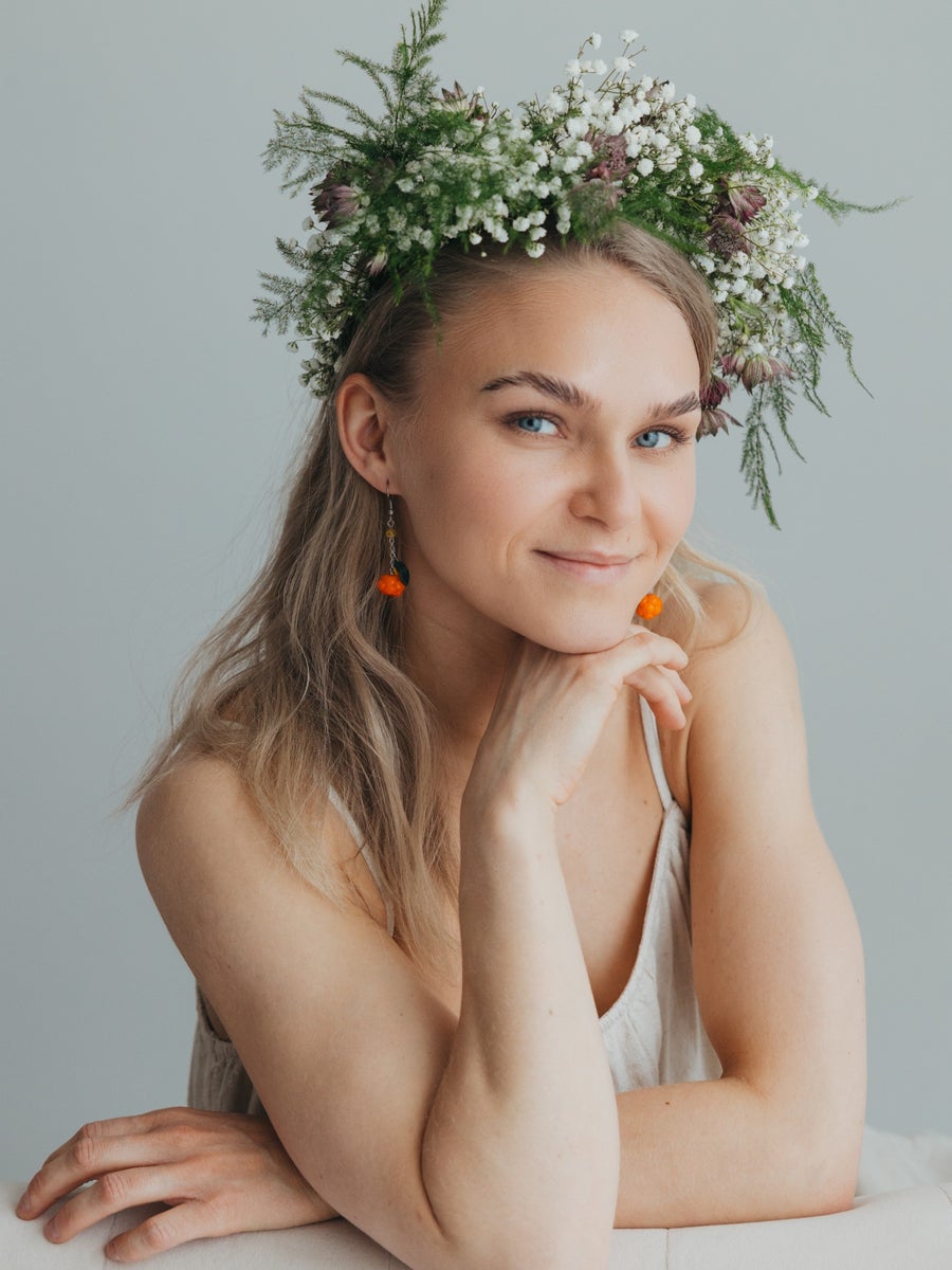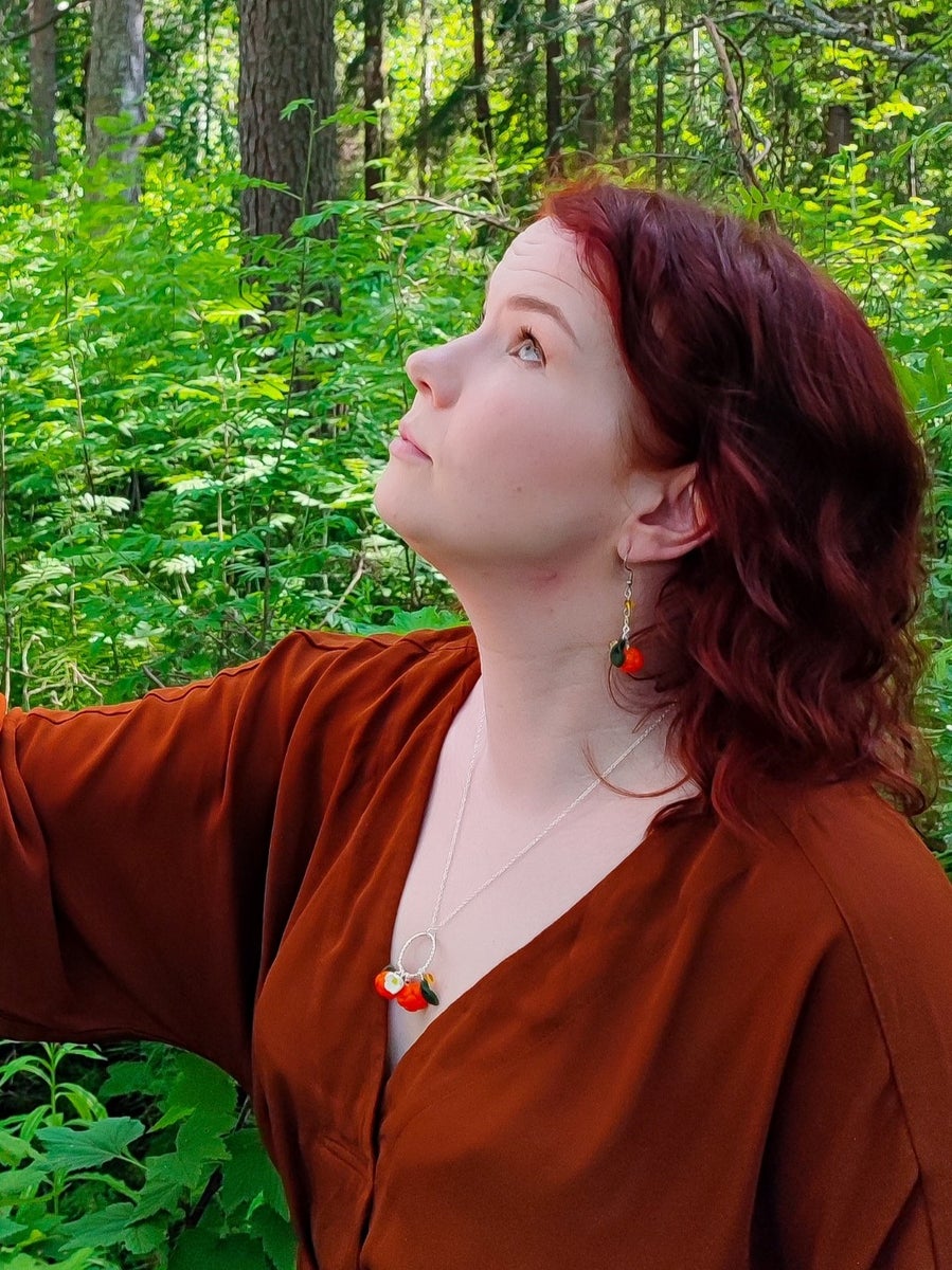 Polymer clay and glass beads. Metal parts are hypoallergenic: surgical steel or 18 carat gold plated surgical steel. Jewellery is nickel free. All parts are waterproof.