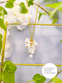 Polymer clay and glass beads. Metal parts are hypoallergenic: surgical steel or 18 carat gold plated surgical steel. Jewellery is nickel free. All parts are waterproof.